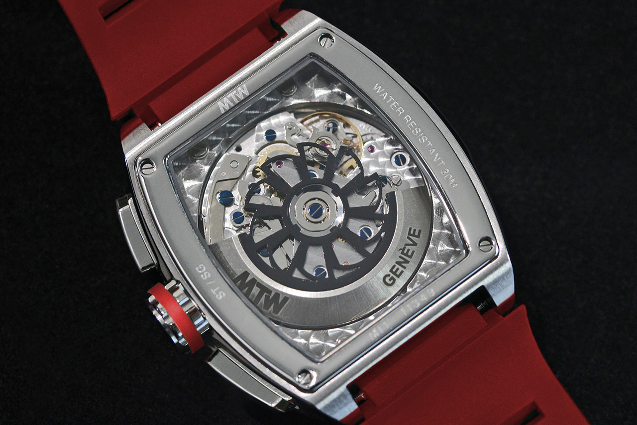 La collection sport MT1, qui se trouve être la deuxième collection automatique de MTWGenève, en tant que gamme de montres chronographes automatique. Elle incarne la passion et l'engagement de MTW, la qualité éprouvée et l’excellence des composants et des matériaux. Le fond saphir offre une vue fantastique sur la masse oscillante en forme de disque de frein.