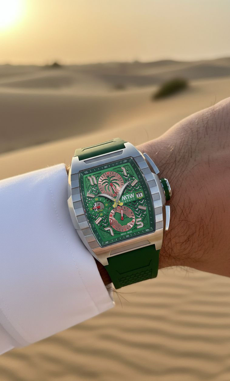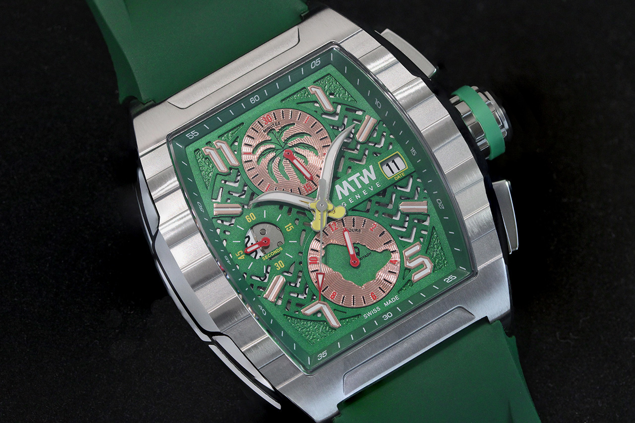 La collection sport MT1, qui se trouve être la deuxieme collection automatique de MTWGenève, en tant que gamme de montres chronographes automatique. Elle incarne la passion et l'engagement de MTW, la qualité éprouvée et l’excellence des composants et des matériaux. Le fond saphir offre une vue fantastique sur la masse oscillante en forme de disque de frein. Les aiguilles signifies l'emblème de l'Arabie saoudite est composé de deux cimeterres avec des lames de couleur argent se croisant et des poignées de couleur or, placées sous un palmier de couleur sinople.